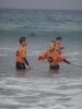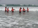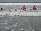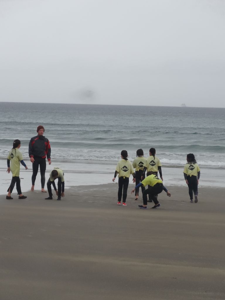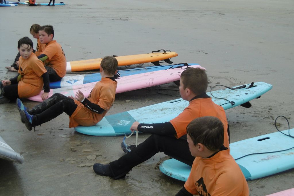 Pour s’échauffer, on faisait des pas chassés, on jouait à saute-mouton ou bien on courait. Ensuite on faisait des exercices : du body surf (glisser sur la vague, sans planche). Puis on essayait de se mettre debout sur la planche et de glisser sur les vagues. On a aussi appris le plongeon canard. Parfois, avec les moniteurs, on s’éloignait un peu du bord pour prendre de plus grosses vagues.