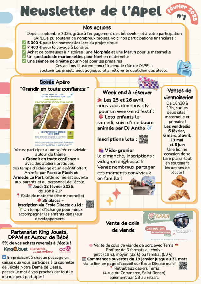 Grande nouveauté ! Voici une super initiative... jeudi 29 janvier 2026, par Directeur de l’école Grande nouveauté ! Voici une super initiative rien que pour vous : la toute première newsletter de l’APEL. Vous y trouverez le plein d’informations et même quelques scoops. Bonne lecture à tous !"