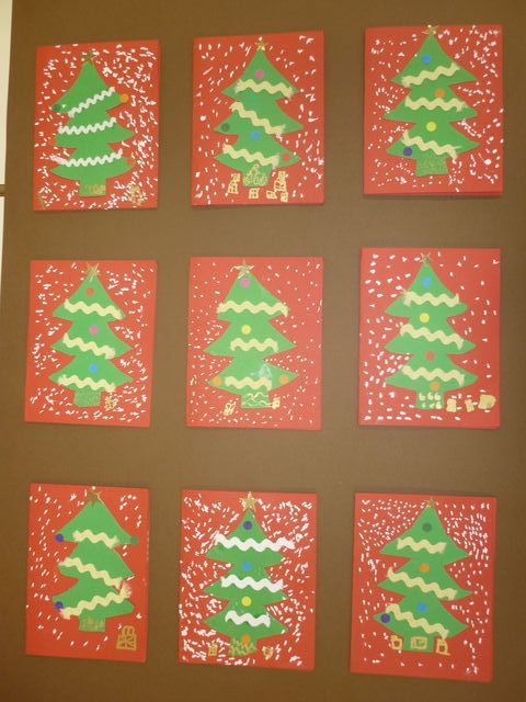 La réalisation des cartes s’est déroulée en plusieurs étapes : tracé du gabarit de sapin, découpage puis collage du sapin sur la carte rouge.