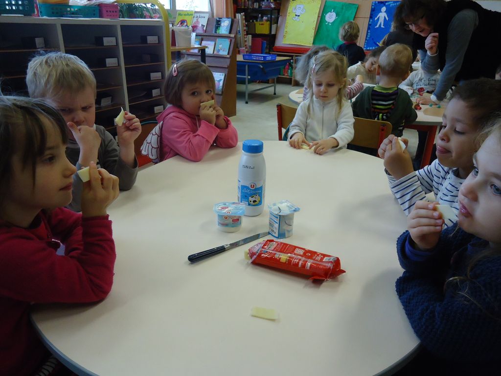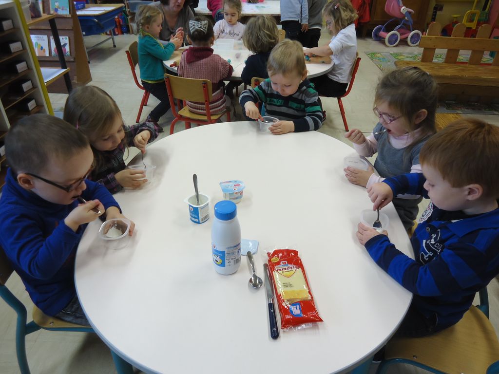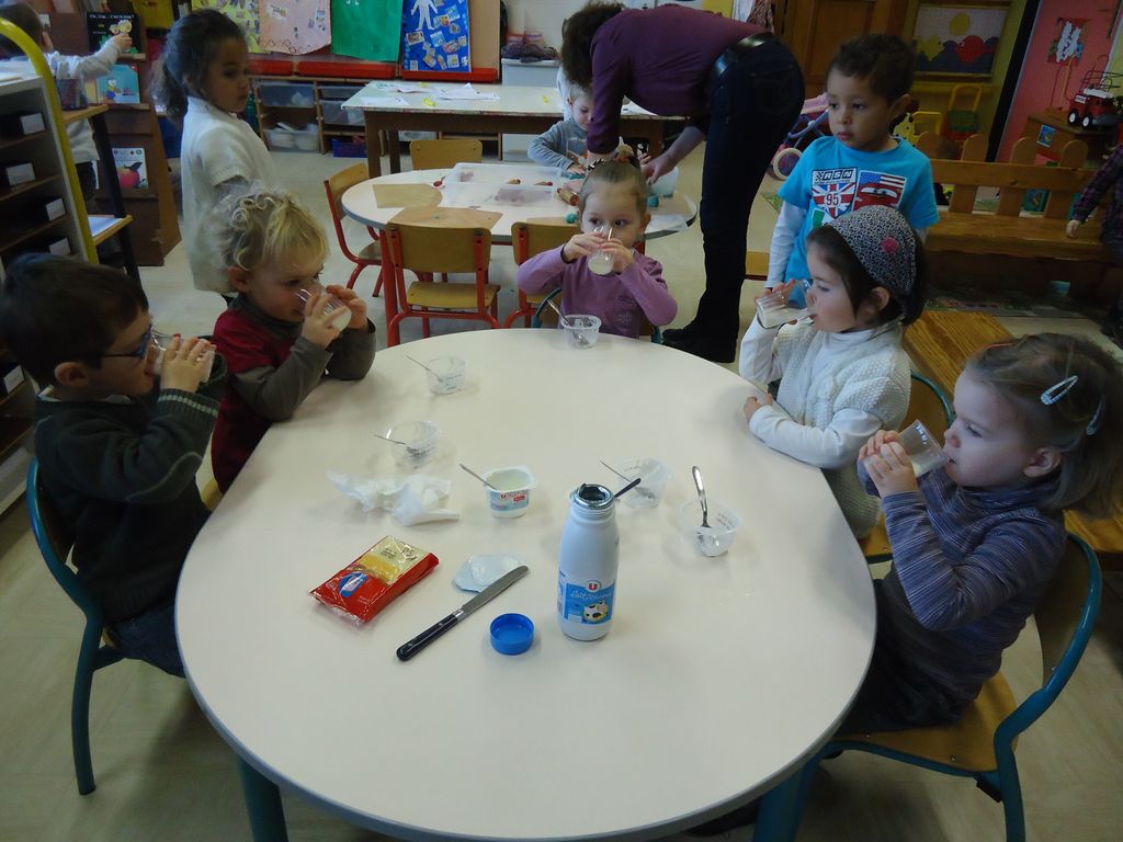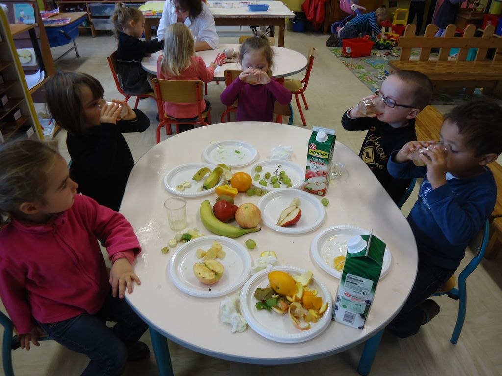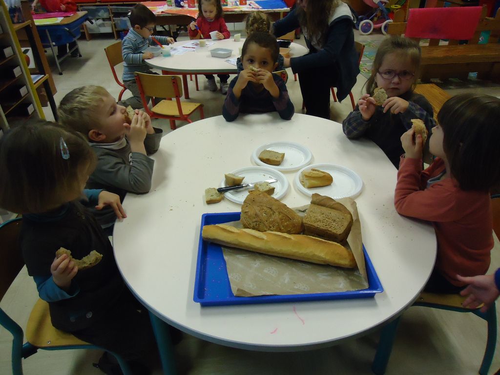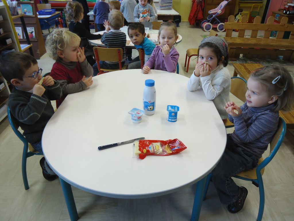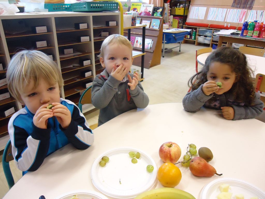 Durant 3 semaines, les élèves des classes PSA, PSB, PS/GS et bilingue ont découvert les aliments qui constituent un bon petit déjeuner : le pain (blanc, complet , aux céréales) , les fruits (pommes, poires, bananes, raisins, kiwis et oranges) et les laitages (yaourts, fromage blanc, fromage et lait).