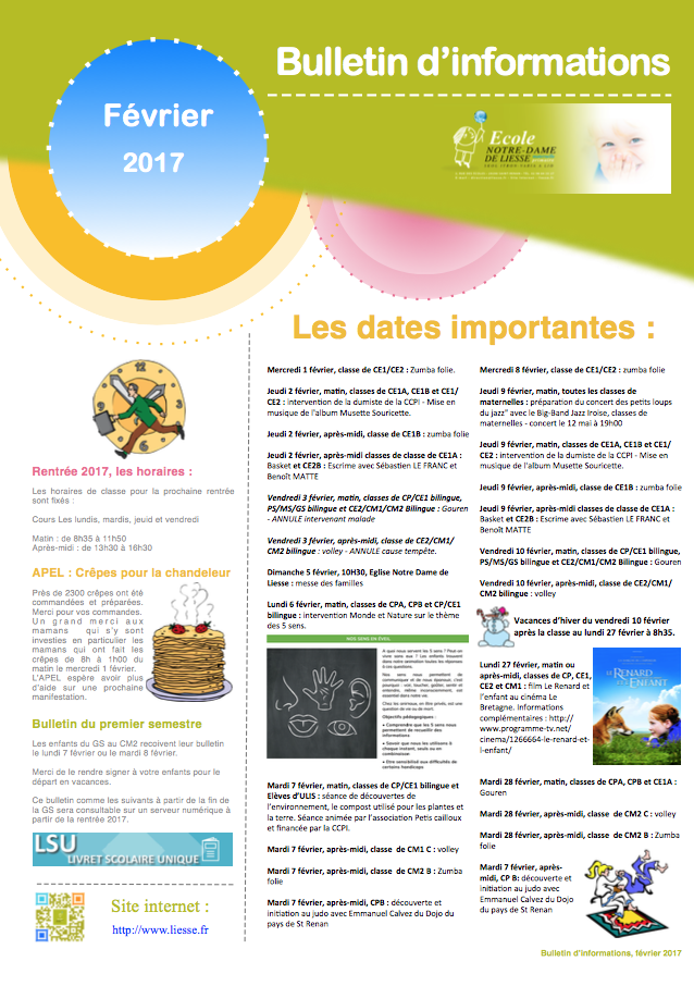Bulletin d’informations du mois de février 2017