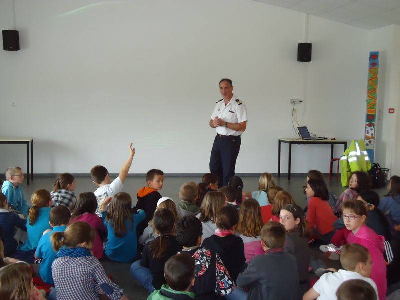 Les élèves de CE2, durant une matinée, ont découvert 2 métiers de la mer avec un champion de voile (l’avez-vous reconnu ?) et un papa marin d’état qui a expliqué la sécurité en mer.