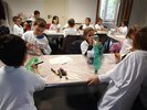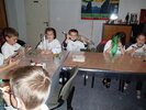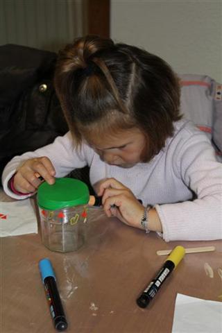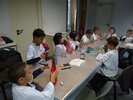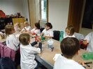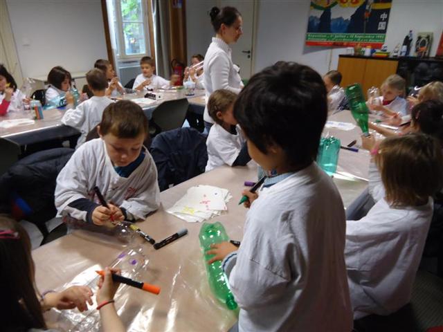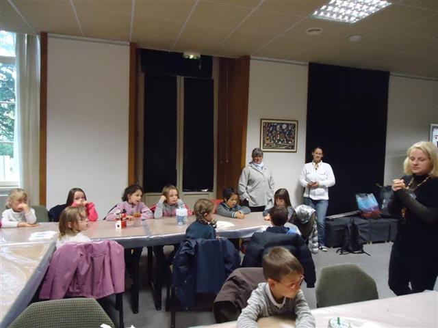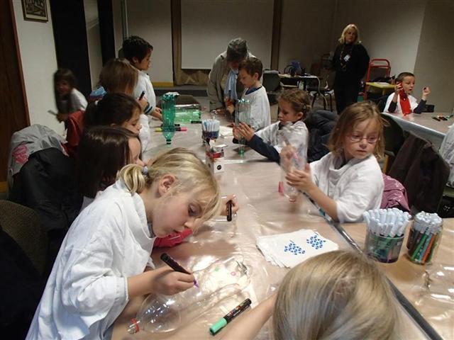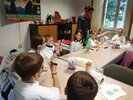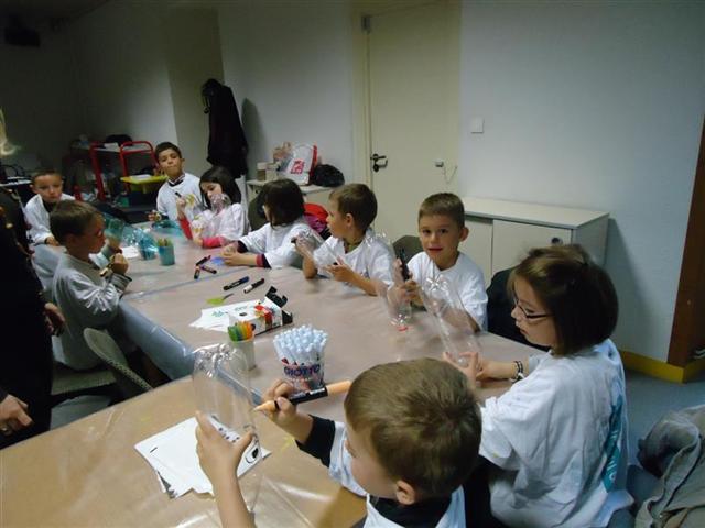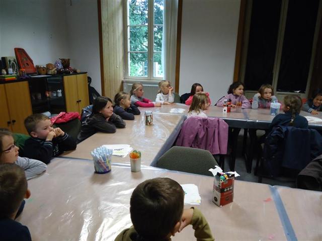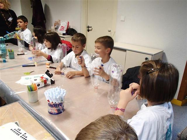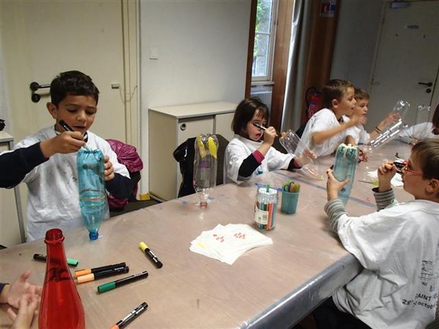 Nous avons d’abord fabriqué un aérophone dans l’atelier pendant que les CP/CE1 bilingues visitaient l’exposition en breton ! puis nous avons visité l’exposition pendant que l’autre classe fabriquait un tambourin (de la famille des membranophones).