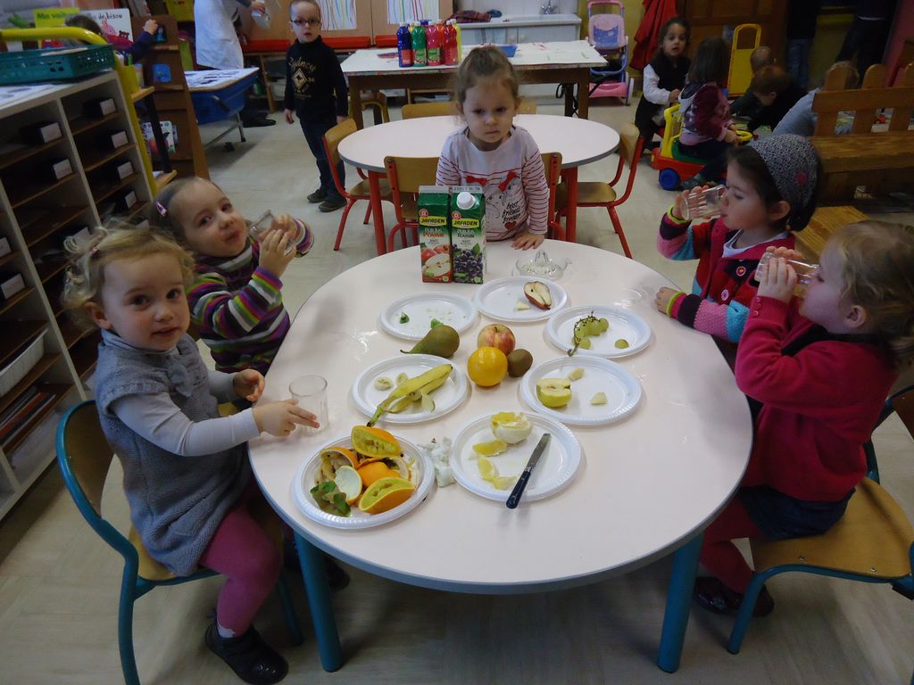 Durant 3 semaines, les élèves des classes PSA, PSB, PS/GS et bilingue ont découvert les aliments qui constituent un bon petit déjeuner : le pain (blanc, complet , aux céréales) , les fruits (pommes, poires, bananes, raisins, kiwis et oranges) et les laitages (yaourts, fromage blanc, fromage et lait).