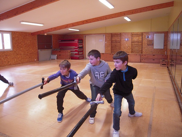 A la fin d’une séquence de 3 ou 4 séances, les élèves ont pu présenter au reste du groupe une représentation d’escrime artistique avec une chorégraphie collective.