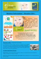 Bulletin d’informations du mois de janvier 2015 samedi 27 décembre 2014, par Directeur de l’école Le bulletin d’informations : Le bulletin en version imprimable :